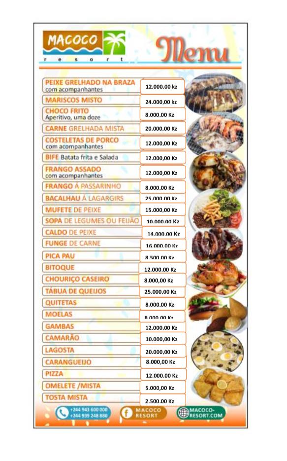 - Permitimos a entrada de comida, mas se optar por fazer as refeições no nosso restaurante, por favor encomende o menu a sua escolha 3 dias antes da sua entrada no resort.